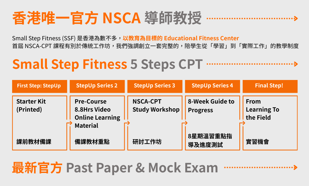 課程內容包括: 1.Printed Starter Kit (課前教材備課) 2.Pre-Course 8.8Hrs Video Online Learning Online Material (備課教材重點) 3.NSCA-CPT Study Workshop (2日研討工作坊) 4.8-Week Guide to Progress (8星期溫習重點指導及進度測試) 5.From Learning To the Field (實習機會)