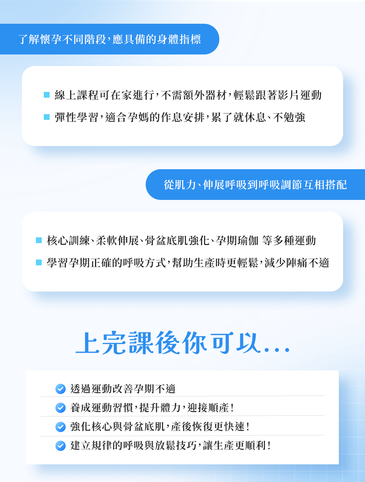課程專為準父母設計,結合專業運動指導,針對孕期不同階段提供安全、科學的運動建議。課程涵蓋體能維持、核心穩定、緩解孕期不適,以及為順產做準備的實用技巧。