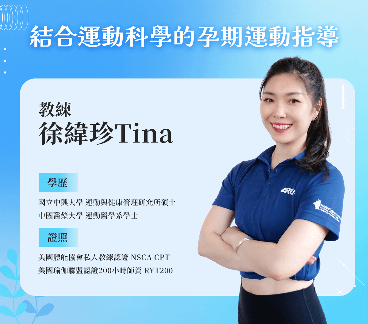ARCA亞洲康復體能學院 助理講師 綻放瑜珈工作室 創辦人 美國體能協會私人教練認證 NSCA CPT 美國瑜伽聯盟認證200⼩時師資 RYT200 挪威紅繩懸吊訓練 Record Neural 1 教育部⼤專院校合格講師證書