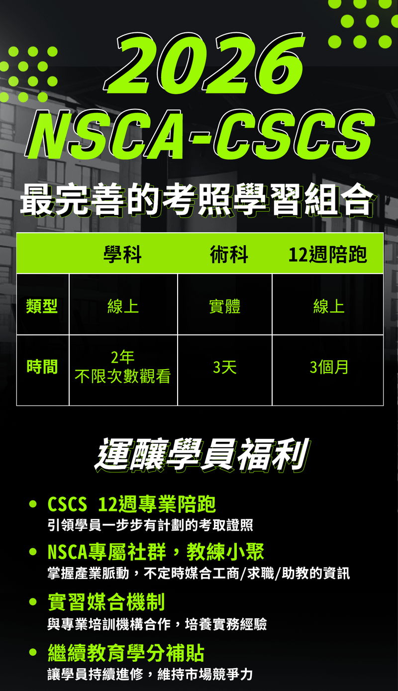 ![NSCA-CSCS肌力與體能訓練專家中文線上課程 - [2026台北] 線上課程+CSCS 3日台北場:6/12-14](https://s.teachifycdn.com/image/width=700,quality=80/curriculum_plan/cover_photo/a913aec0-b952-41f9-bd5e-a5f6785a602a/af33c7a1-0272-425f-b4ad-5e67e457668c.jpg)