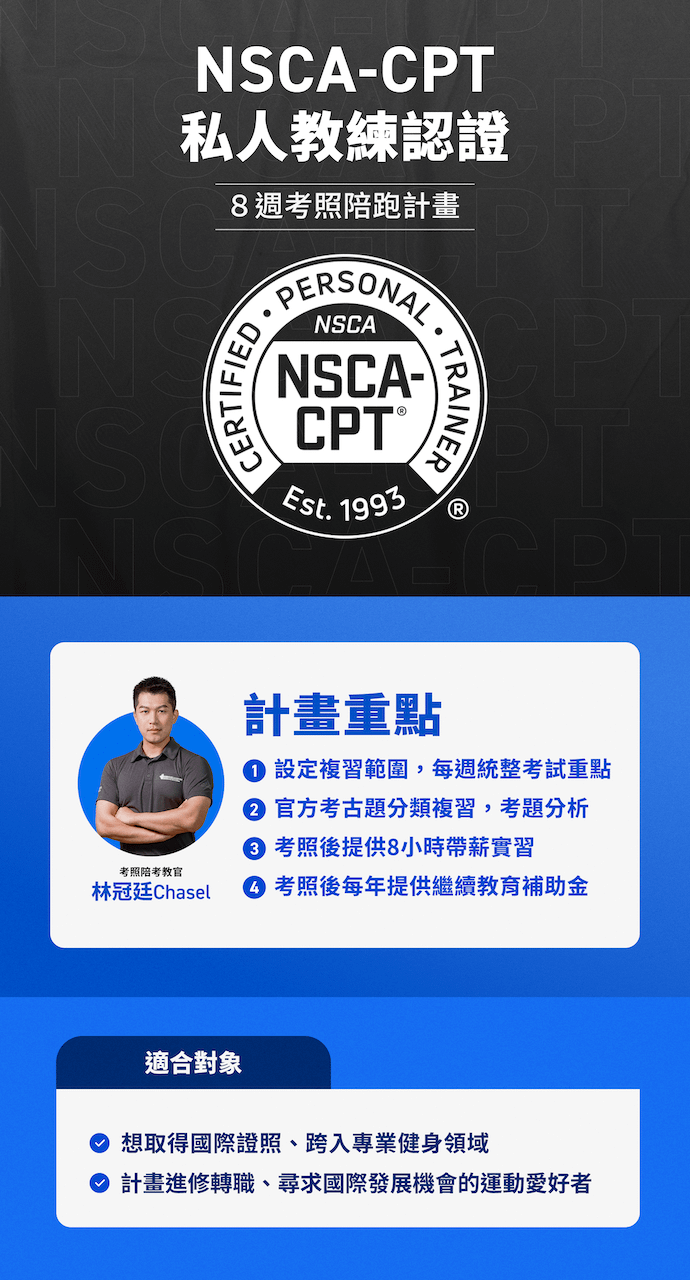 這是一個專為即將迎戰NSCA-CPT考試的學員設計的密集訓練計畫。我們了解學習的路上常常遇到瓶頸,於是特別設計了這個「陪跑衝刺班」,從考試重點解析、知識整合、解題技巧到實戰模擬,逐步帶領您強化每一個章節的內容,確保您不再孤軍奮戰,持續保持進步。