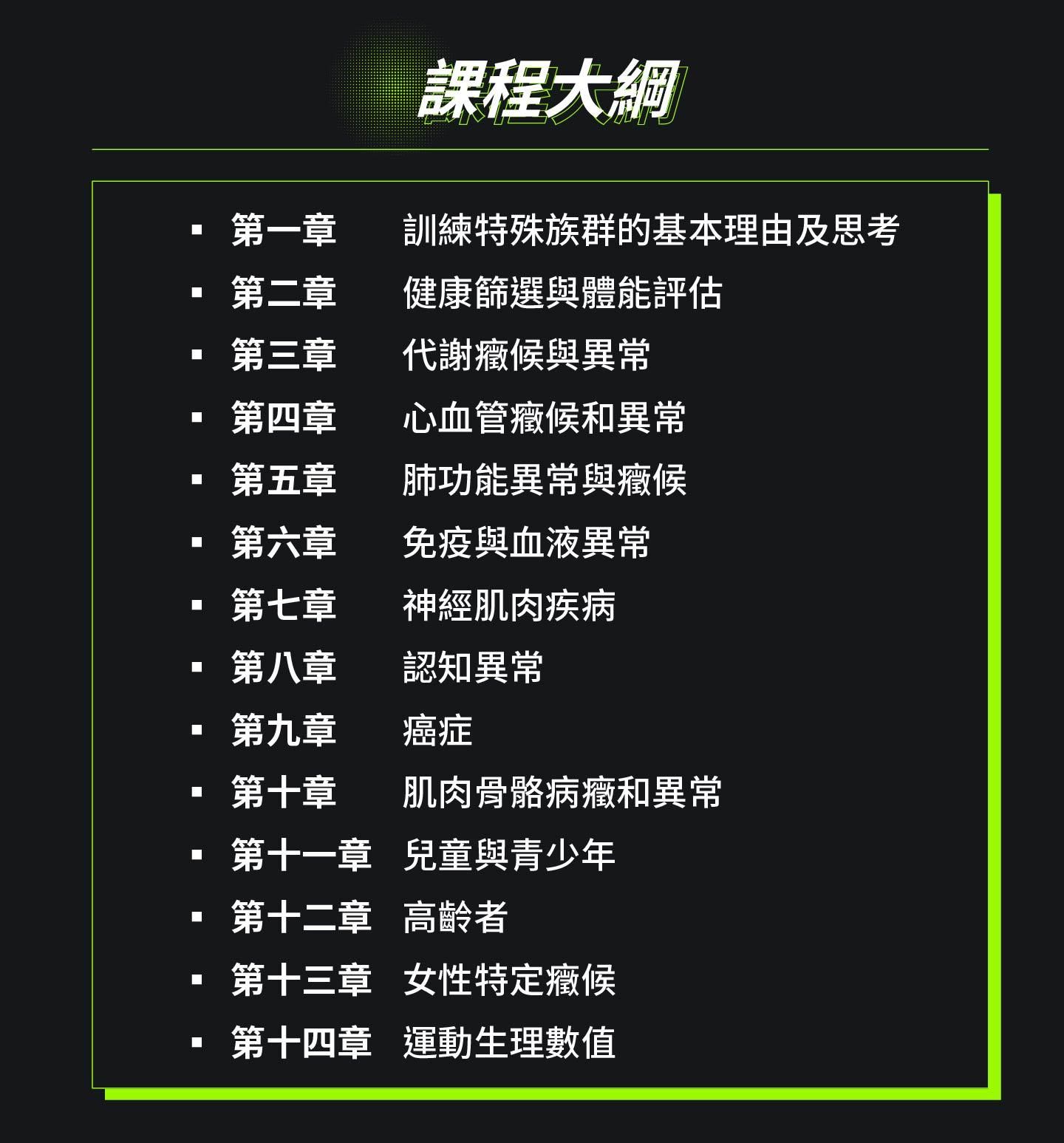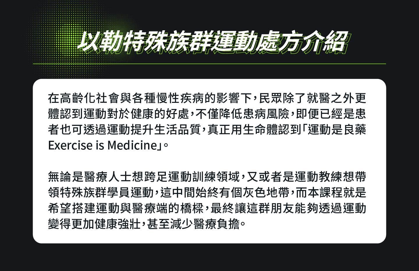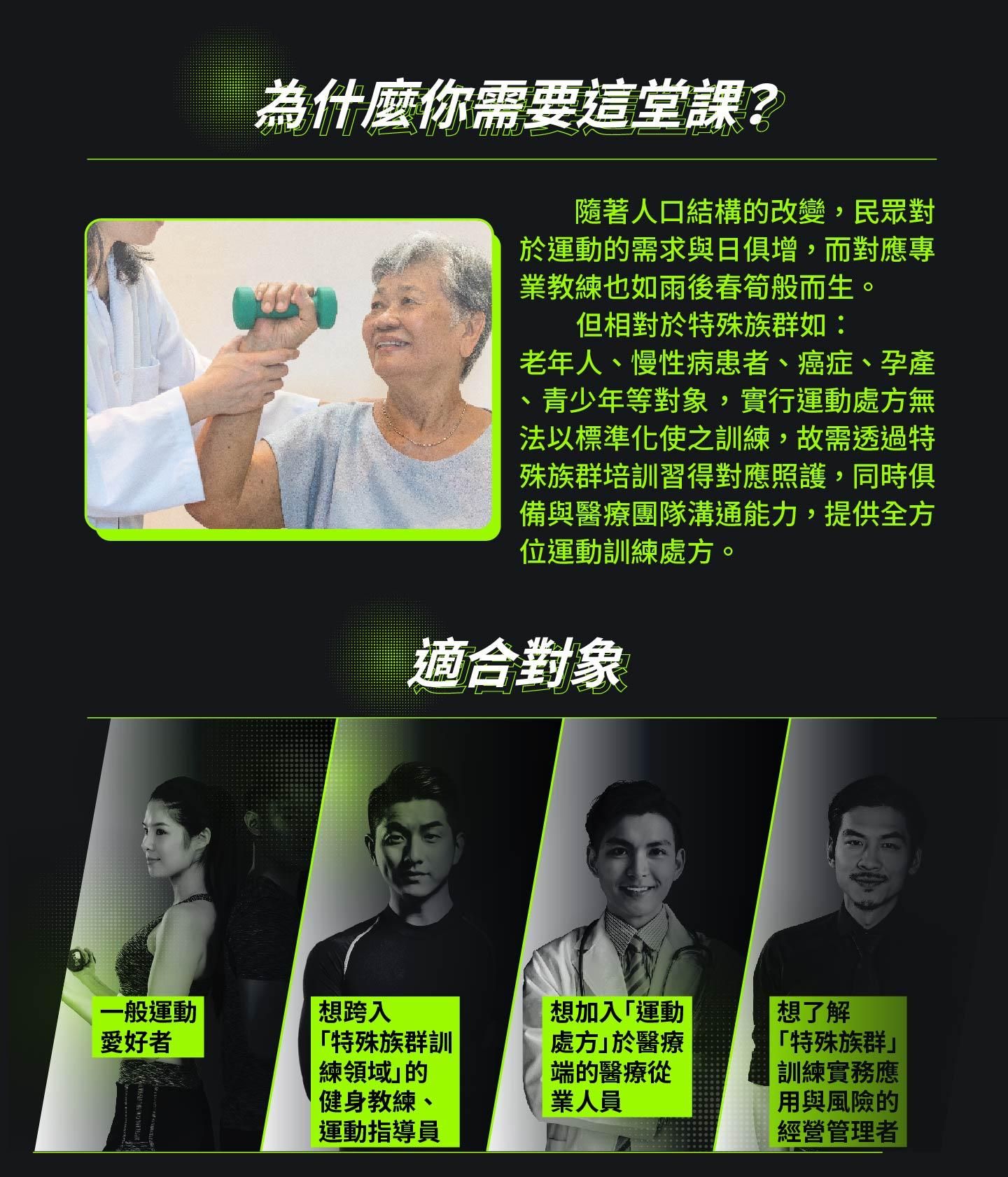 學員透過特殊族群培訓習得對應照護,同時俱備與醫療團隊溝通能力,提供全方位運動訓練處方。