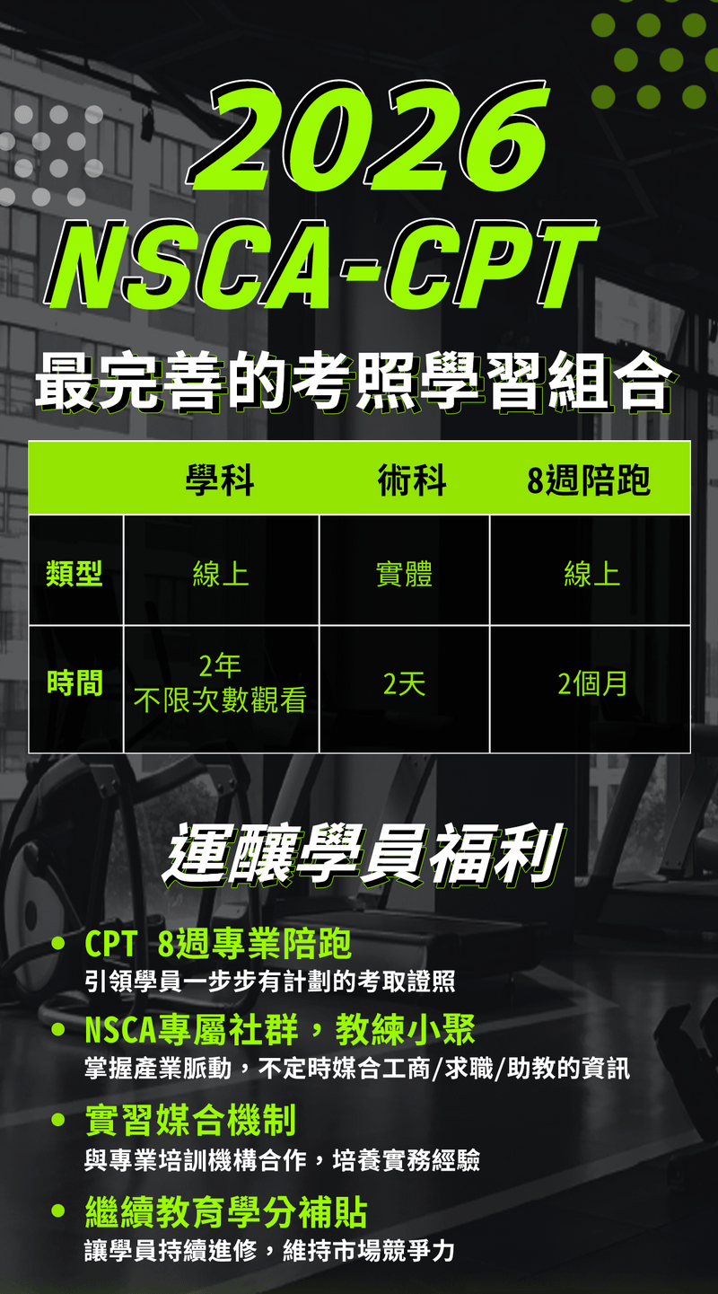 ![NSCA-CPT 私人教練認證中文線上課程 - [2026台北] 線上課程+CPT2日:12/5-6](https://s.teachifycdn.com/image/width=700,quality=80/curriculum_plan/cover_photo/953152c5-648e-4ba4-a7b6-287df9875ef0/f9c6290f-952c-410b-8891-6ef17e3a5709.jpg)
